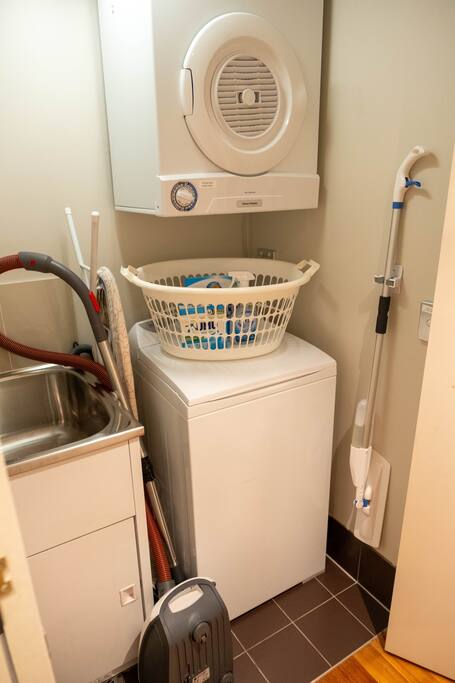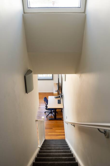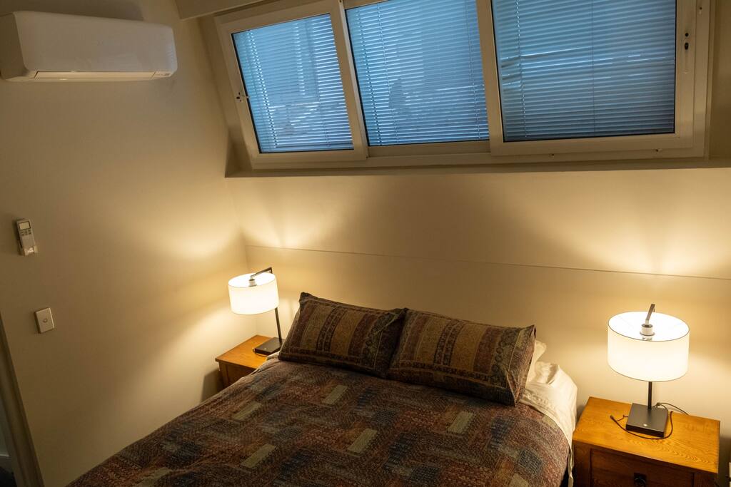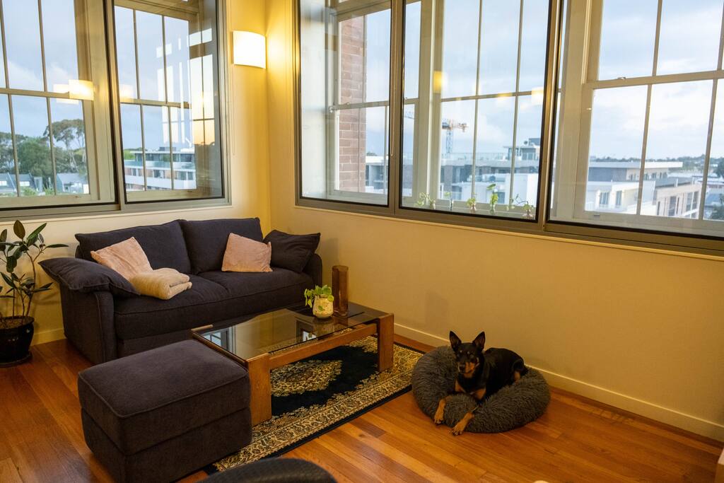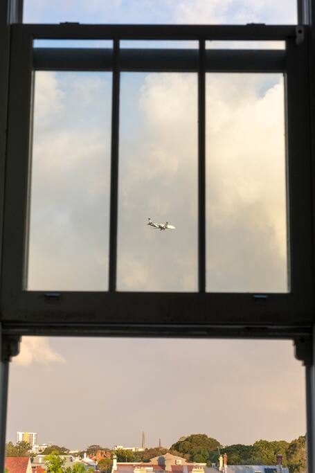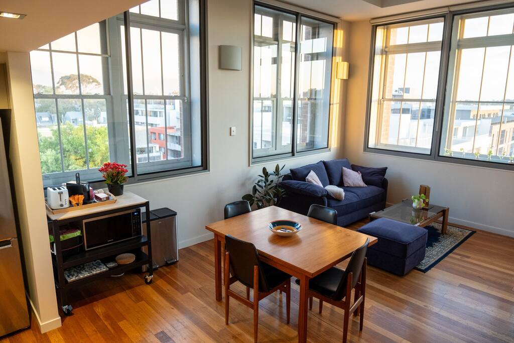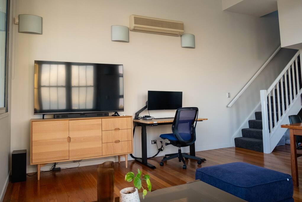 Enjoy the spacious double high ceilings of the combined kitchen and living area. The bedroom and bathroom are upstairs, with a laundry under the stairs. There is a comfortable workspace in the main living room with an adjustable-height standing desk, a large curved computer monitor, and very fast internet - (1000/1000mbps). The comfy couch folds out into a sofa bed, for cosy enjoyment of the massive LG smart TV. The building offers a pool to cool off, and a gym to maintain your routine. Please be aware that the apartment is directly under the flight path, however, the heavy-duty double-glazing throughout is very effective at keeping even the largest jet engines to nothing but a soft purr. A plane-spotter's dream.